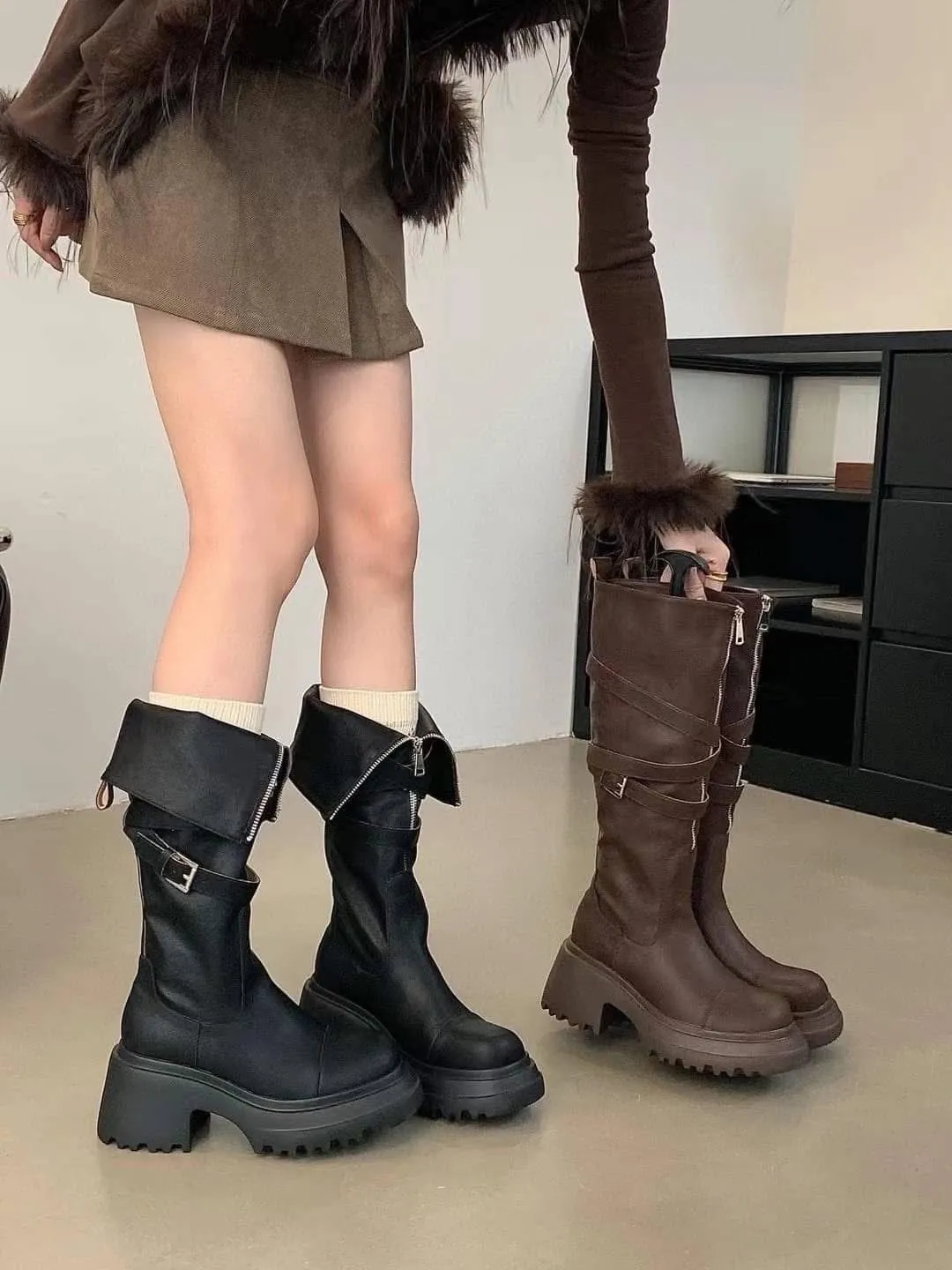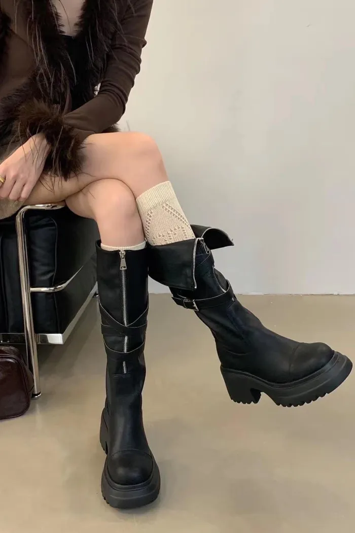 真皮反摺拉鍊長靴