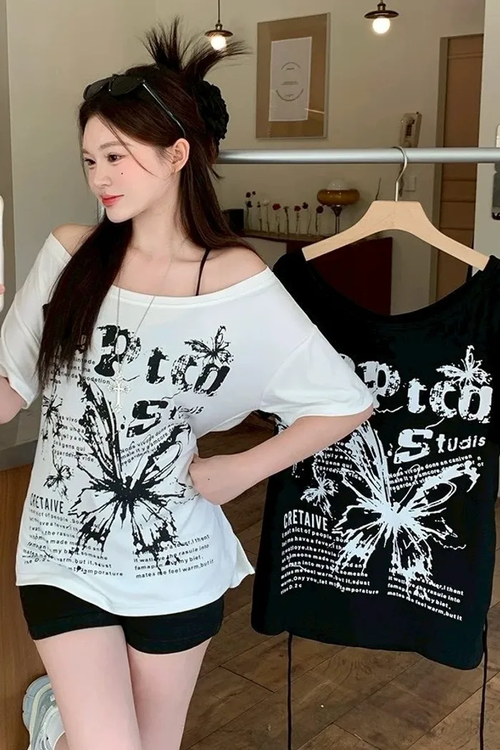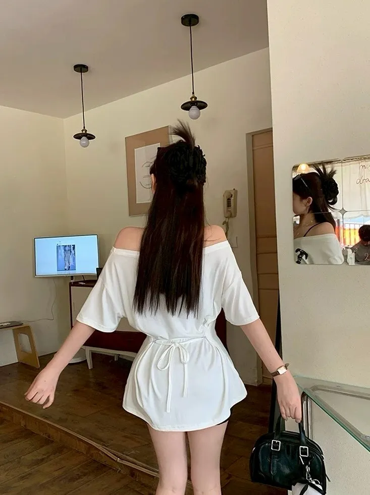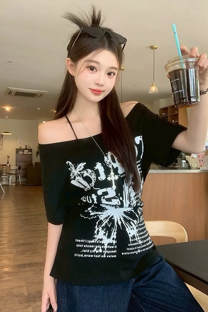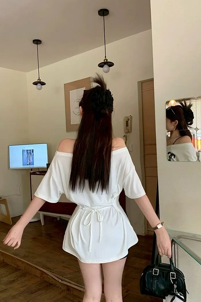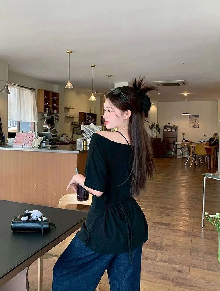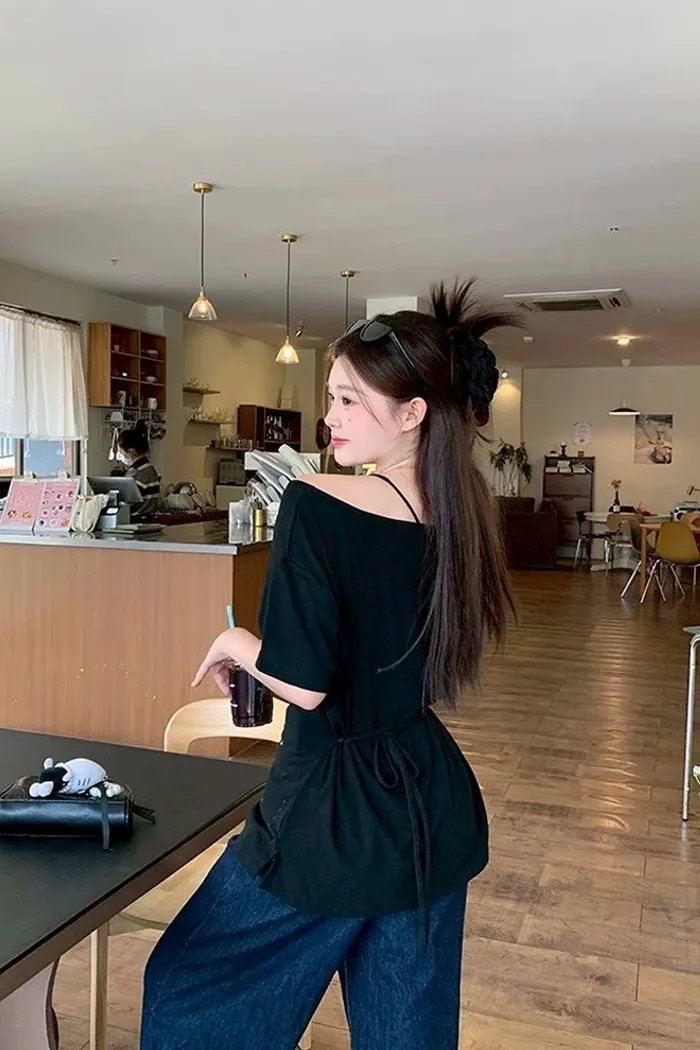 斜肩蝴蝶綁帶T